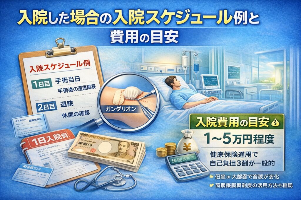 「なぜ1日だけ?」「2日になるのはどんなとき?」と疑問に思いますよね。これは、ガングリオンが深い位置にある場合や、術後に腫れや痛みの経過を慎重にみたい場合など、安全面を優先するためとされています。状態が安定していれば、翌日には退院できるケースもあるようです。