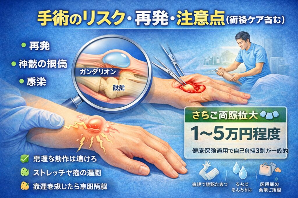 「手術すればもう安心?」と聞かれることがありますが、一定のリスクや再発の可能性があると言われています。具体的には、神経の近くにできたガングリオンでは、しびれや違和感が一時的に出ること、また傷口からの感染などが挙げられます。