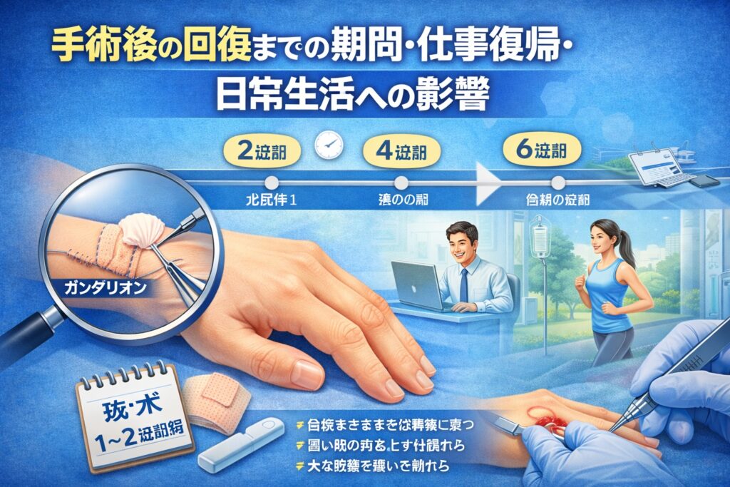 これは多くの方が気になるポイントです。日帰りで行われるガングリオン手術の場合、術後数時間は安静にし、その後も数日間は患部を無理に使わないことが大切だと言われています。