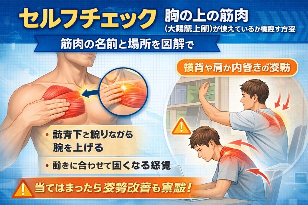 このとき、指の下でふくらみや硬さの変化を感じられれば、大胸筋上部が動いている可能性があるとされています。