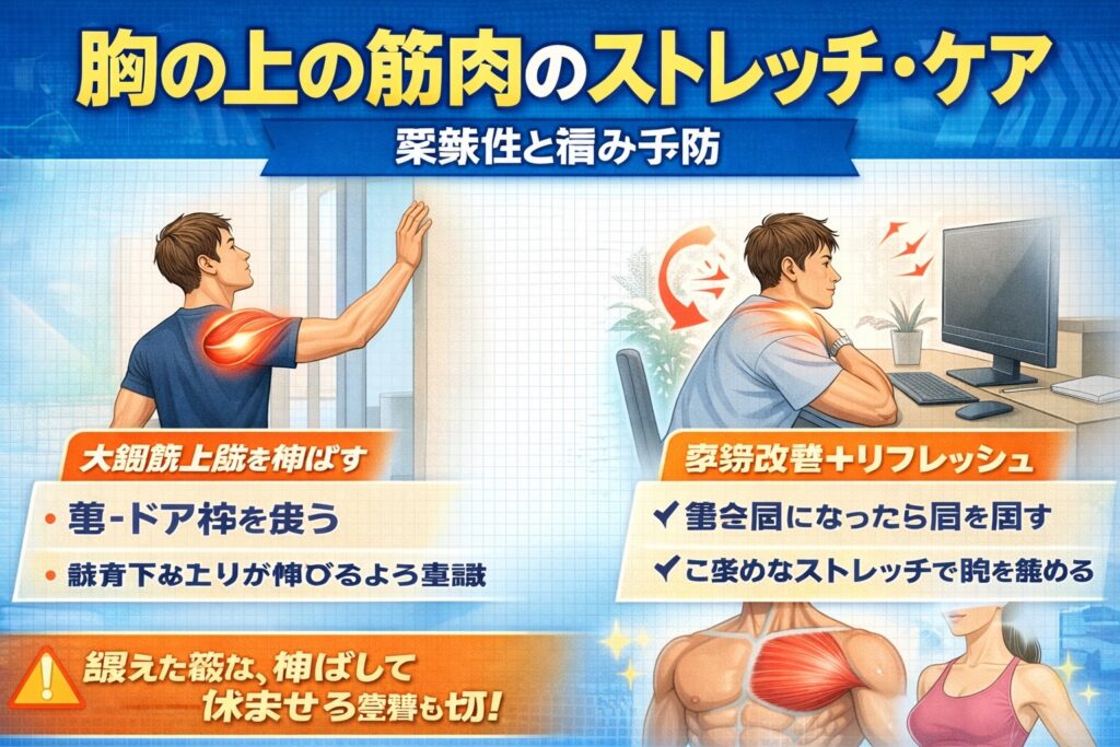 実はこの質問、とても多いです。検索結果を見ても、柔軟性や肩こりとの関係に関心を持つ方が増えていると言われています。胸の上の筋肉(大胸筋上部)は、縮こまりやすい部位のため、ストレッチや日常ケアも重要だと考えられています。