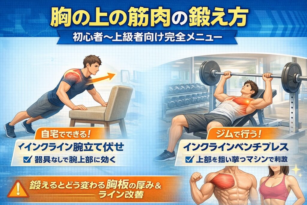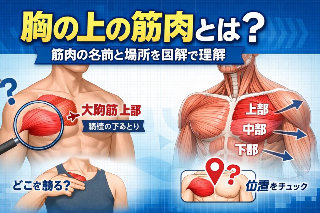 胸の上の筋肉(大胸筋上部)は、胸板の厚みをつくる重要な筋肉です。本記事では、位置・働き・セルフチェック、効果的な筋トレ・ストレッチ、姿勢改善まで初心者でも理解できる完全ガイドを紹介します。