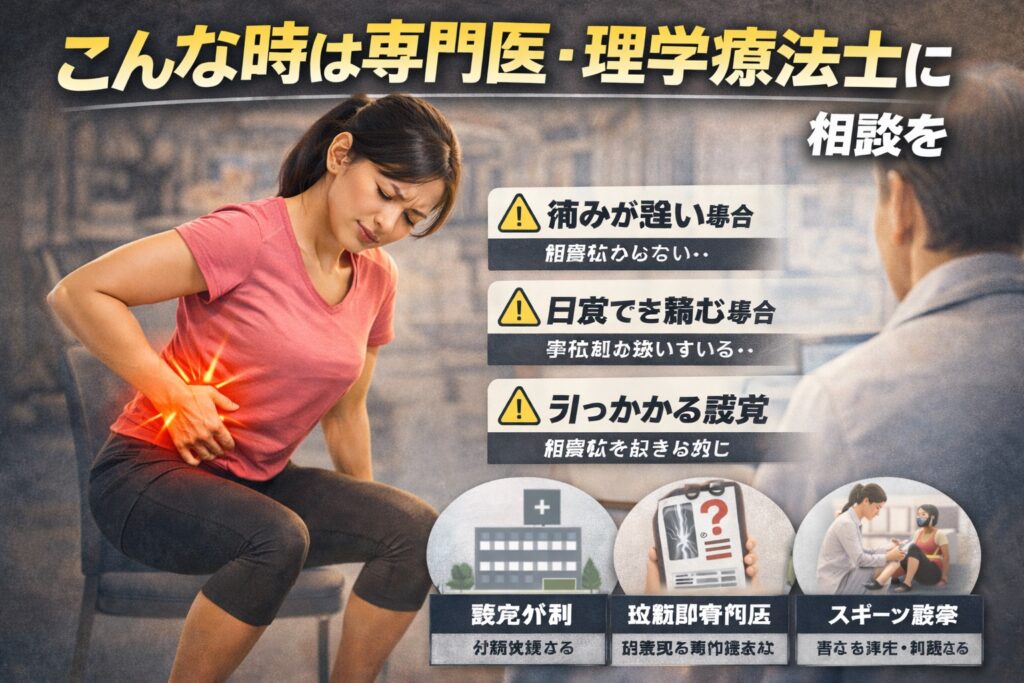 スクワットでの股関節の痛みは、様子を見ながら調整していくケースも多い一方で、専門家に相談したほうがよいタイミングがあるとも言われています。