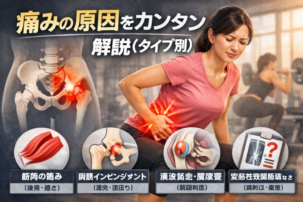 「スクワットで股関節が痛い」と一言でいっても、原因は一つとは限らないと言われています。