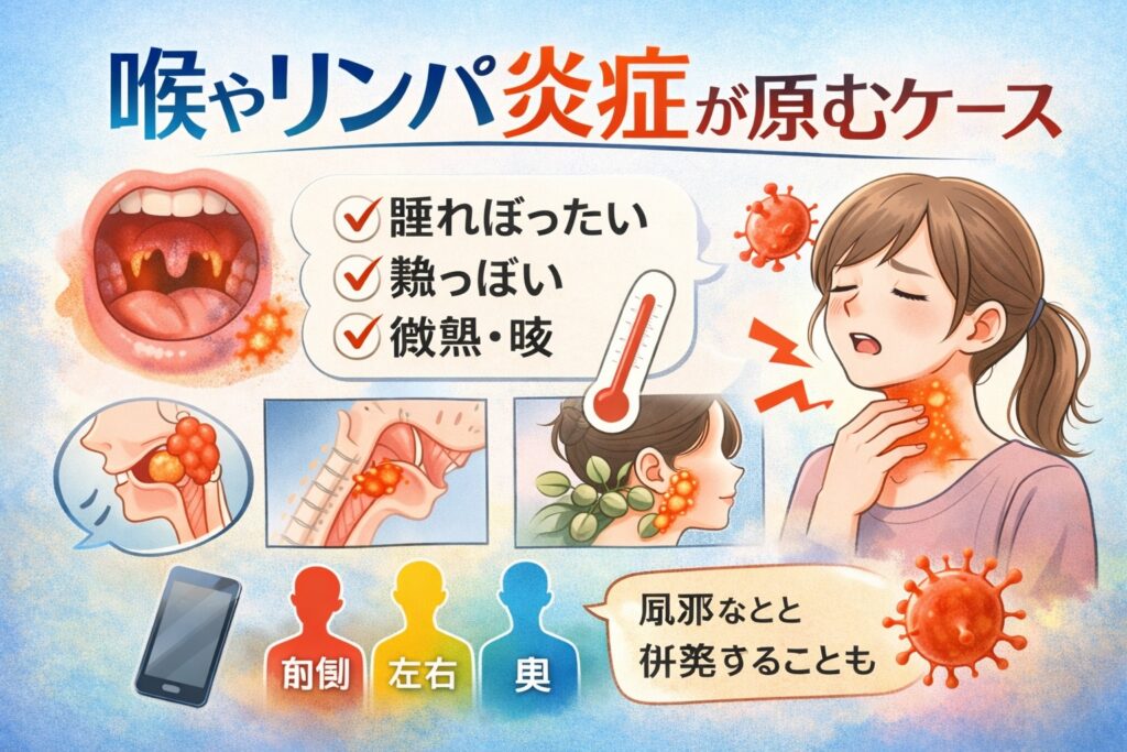 これらが当てはまる場合、喉やリンパの炎症が関与している可能性があると考えられています。