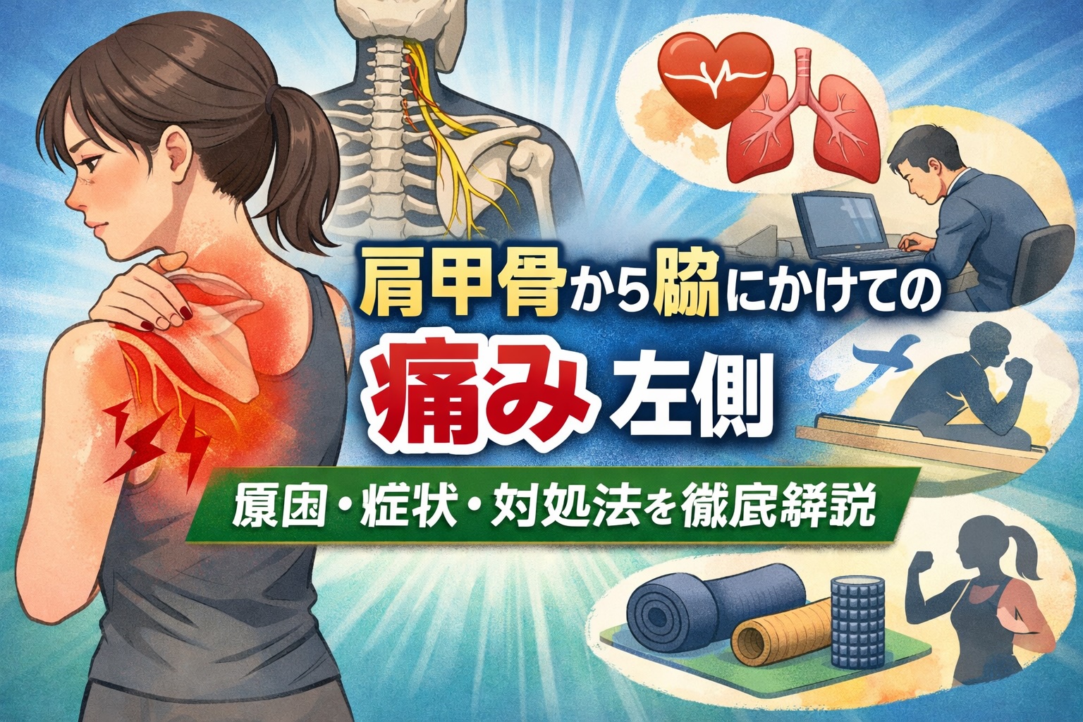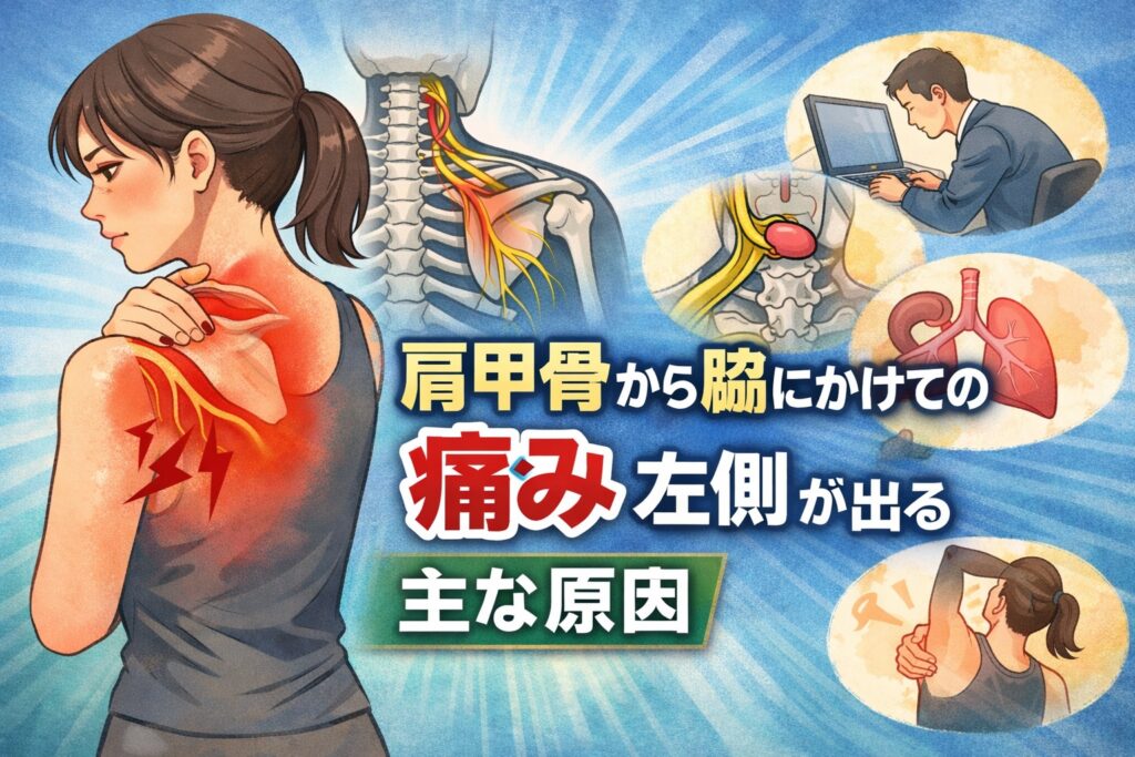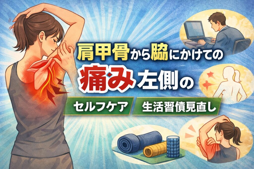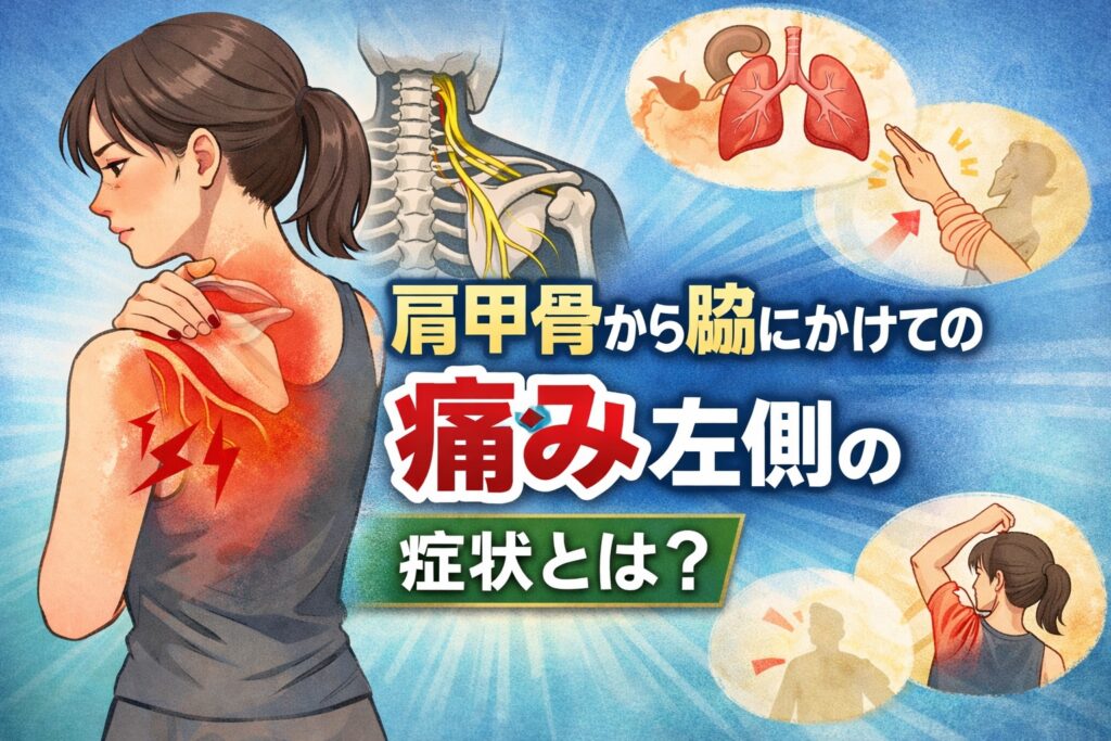肩甲骨から脇にかけての痛み 左側が気になる方へ。筋・骨格の問題、神経・内臓の関連痛、セルフチェック方法、効果的なストレッチ・改善法、医療機関受診の目安までわかりやすく解説します。安心して日常生活を過ごすための正しい知識をお届けします。
