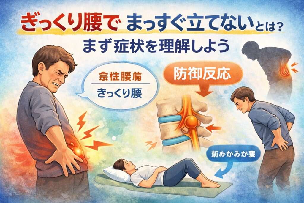 「朝、立ち上がろうとした瞬間に腰が固まった」「伸ばそうとするとズキッとくる」——こんな声、実はとても多いです。ぎっくり腰でまっすぐ立てない状態は、体が危険を避けようとして起こす“防御反応”だと言われています。ここでは、まず症状の正体から整理していきましょう。
