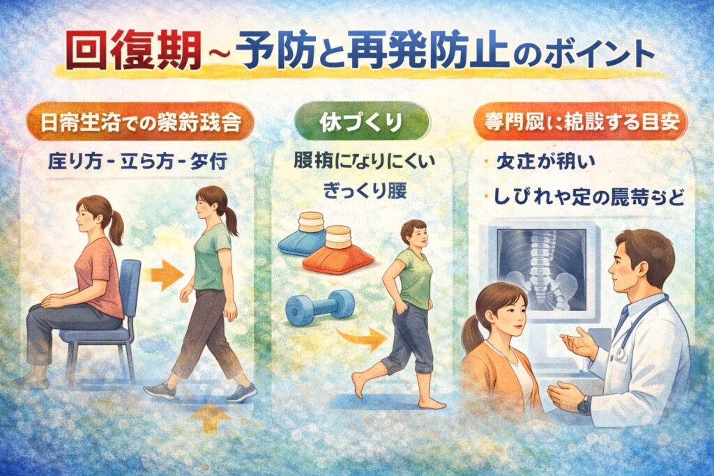 回復期は、無理をしない一方で、再発を防ぐ意識が大切だと言われています。ここでは、日常で気をつけたい点と、相談の目安を整理します。
