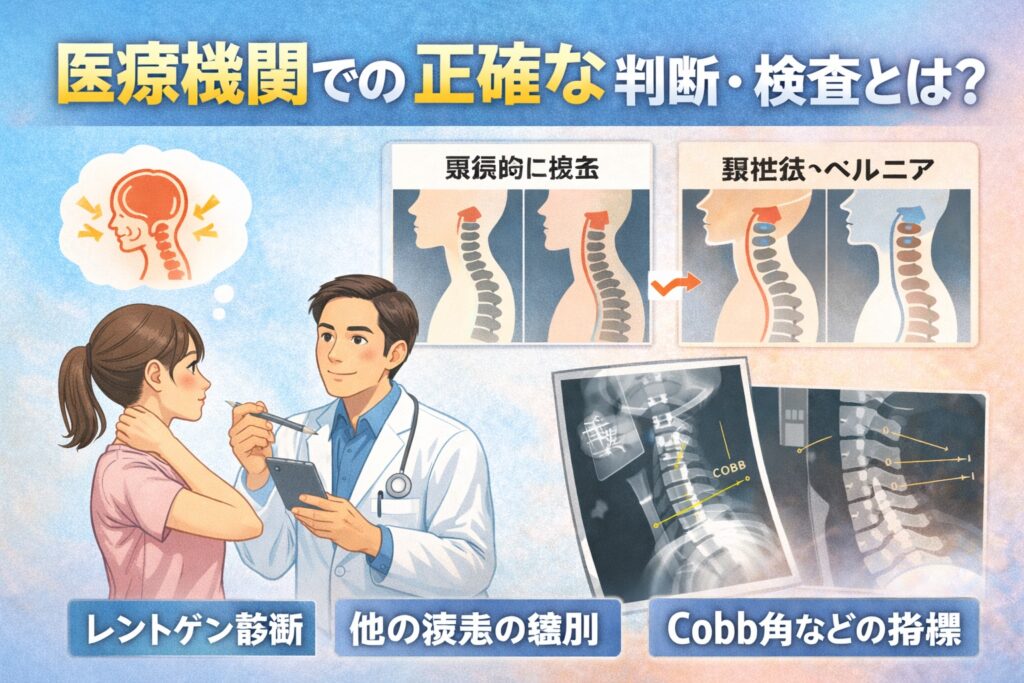 そう感じたら、医療機関での画像による評価が一つの目安になると言われています。整形外科では、首の状態をレントゲンで確認し、骨の並びやカーブの様子を多角的に見ていく流れが一般的です。見た目や感覚だけではわかりにくい部分を客観的に把握できる点が重要だと紹介されています。