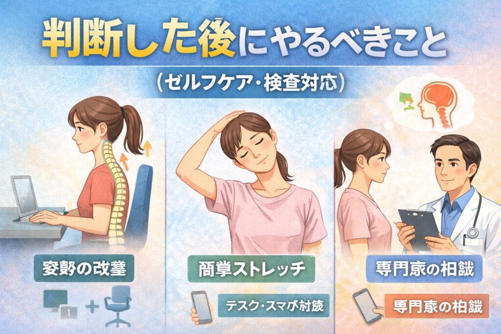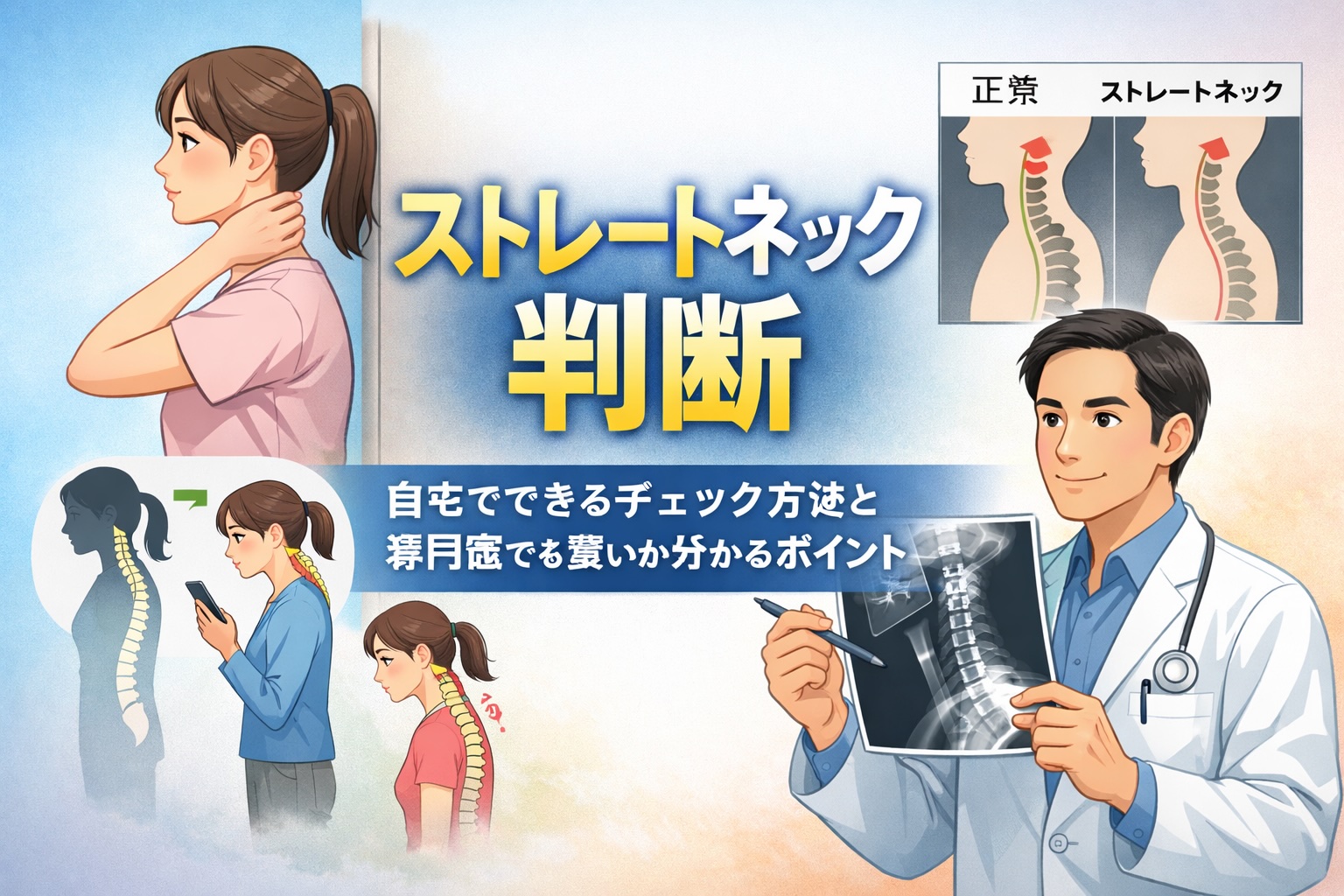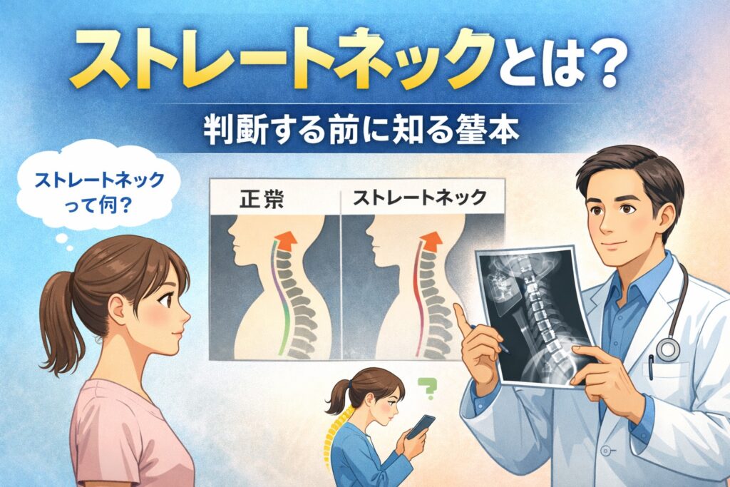 つまり、スマホ首がきっかけでストレートネック“のように見える”ケースもある、というイメージです。まずは関係性を正しく理解し、落ち着いて判断していきましょう。