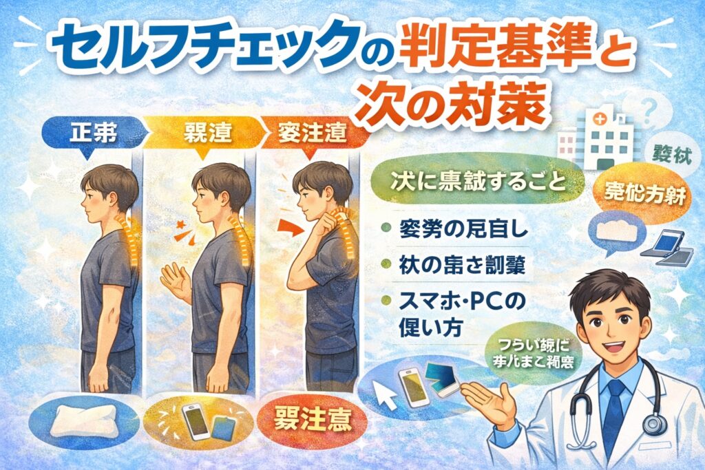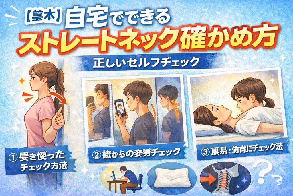 ストレートネック 確かめ方をわかりやすく解説! 自宅で簡単にできるチェック方法(壁チェック/横姿勢/写真・鏡での確認)をステップごとに紹介し、どの状態なら注意すべきか、専門家受診の目安まで丁寧に説明します。