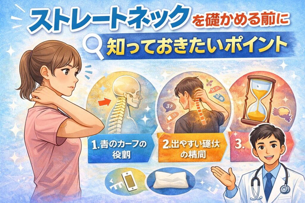「じゃあ放っておいていいの?」と思うかもしれませんが、そう単純でもないと言われています。日頃の姿勢、スマホの使い方、枕の高さなど、生活習慣が積み重なって起こりやすい状態と考えられています。つまり、意識次第で見直せる余地がある、ということです。まずは正しく知ることが、首への負担を減らす第一歩になると言われています。