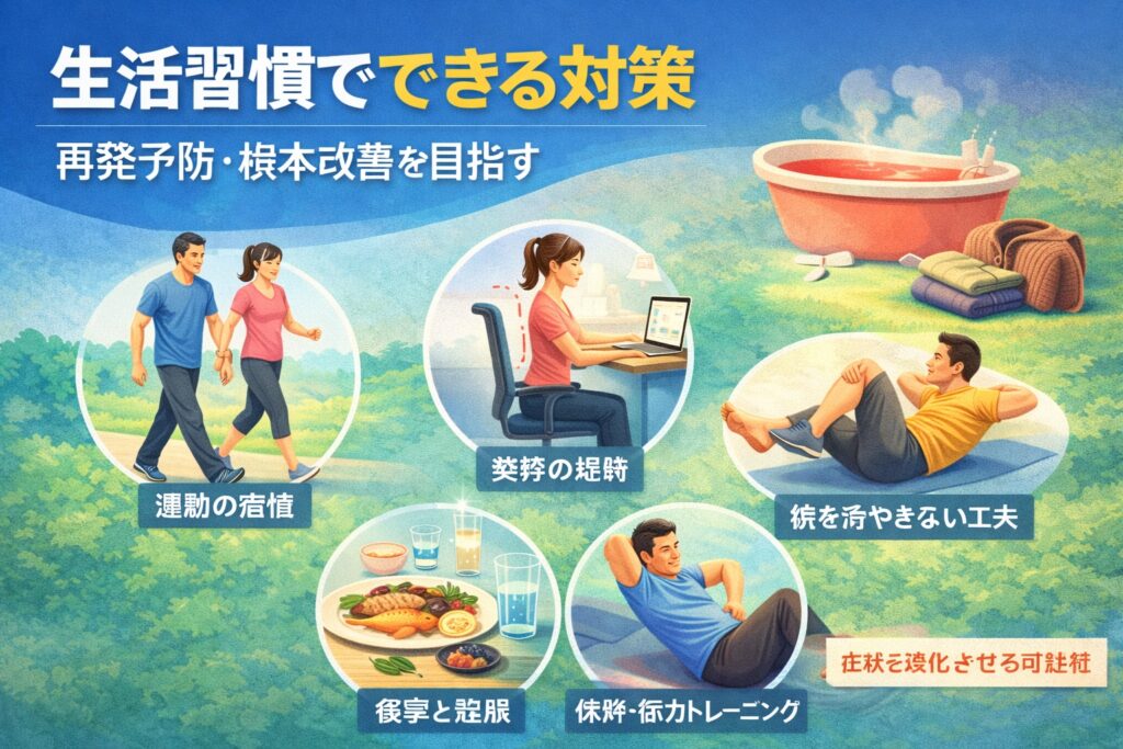 A. 一時的な対策より、日常生活の積み重ねが大切だと考えられています。姿勢、運動習慣、体を冷やさない工夫などを続けることで、再発しづらい体づくりにつながると言われています。