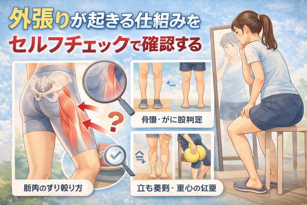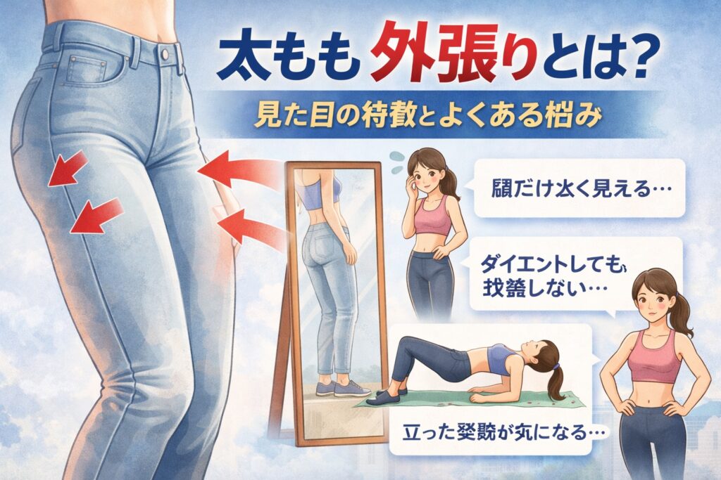 太もも 外張り 原因を徹底解説! 「太ももが横に張って見える」「脚だけ細くならない」と感じる方へ、外張りが起きる主な原因(筋肉バランス・骨格の歪み・重心のズレ)と、今日からできるチェック方法・改善アプローチをわかりやすく解説します。