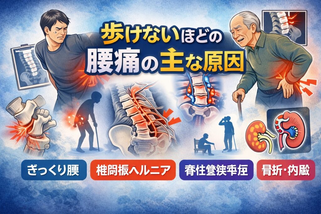 腰痛 歩けない原因は何? 激しい痛みで歩けないときに考えられる病気(ぎっくり腰・椎間板ヘルニア・脊柱管狭窄症など)や、対処法・緊急度・医療機関の受診タイミングをわかりやすく解説します。