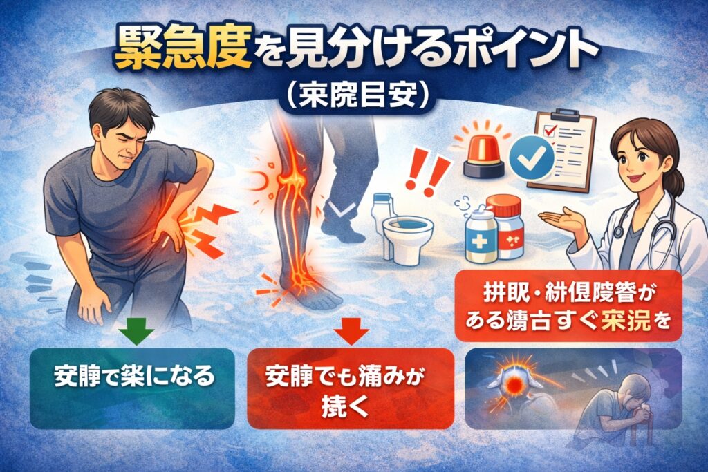このような感覚が近いかもしれません。検索上位の記事でも、痛みの強さと日常動作への影響度が判断材料として重視されていると言われています。