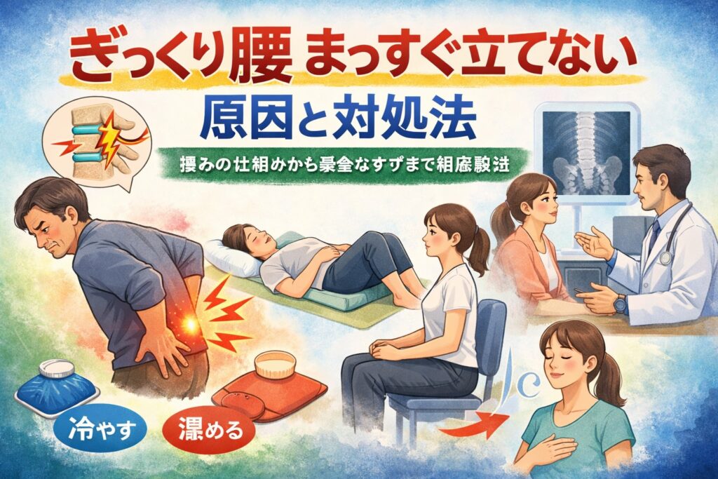 ぎっくり腰 まっすぐ立てないときの原因を詳しく解説。急性腰痛(ぎっくり腰)の仕組み、まっすぐ立てない理由、症状別の安全な対処法やセルフケア、起き上がり方まで初心者にもわかりやすくまとめています。 【】 「朝、立ち上がろうとした瞬間に腰が固ま...