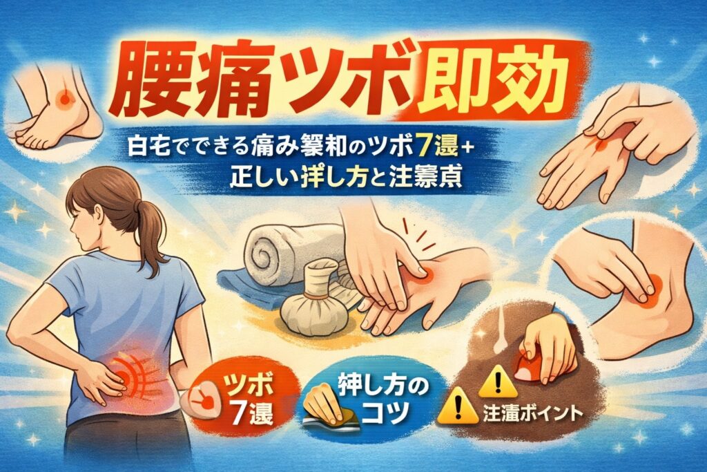 腰痛ツボ即効によるセルフケア方法を解説します。即効性が期待できる代表的なツボ7選と、正しい押し方、痛みを悪化させない注意点もわかりやすく紹介します。 【1.腰痛ツボ即効とは? 今すぐ知りたい効果としくみ】 「腰が痛い…今すぐ何とかしたい」そんな... -