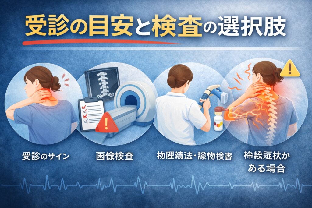 首の痛みに加えて、頭痛や腕のしびれを感じる場合は、神経への影響が疑われることもあると言われています。この場合、セルフケアだけで様子を見るのは不安が残るため、早めに専門家へ相談する判断も大切です。