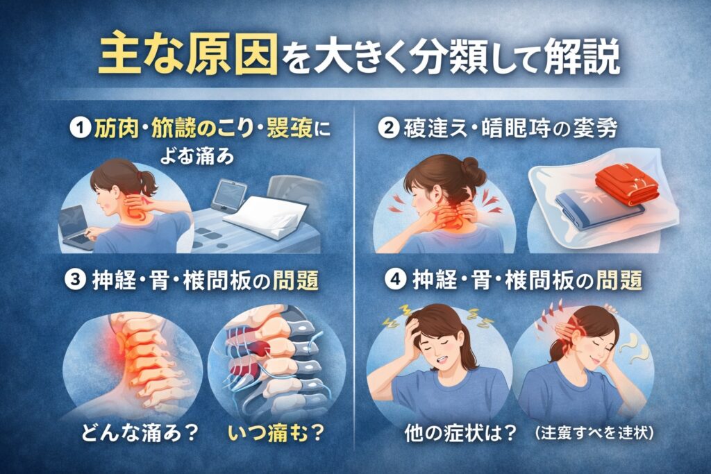 ① 筋肉・筋膜のこり・緊張による痛み(最も多い)