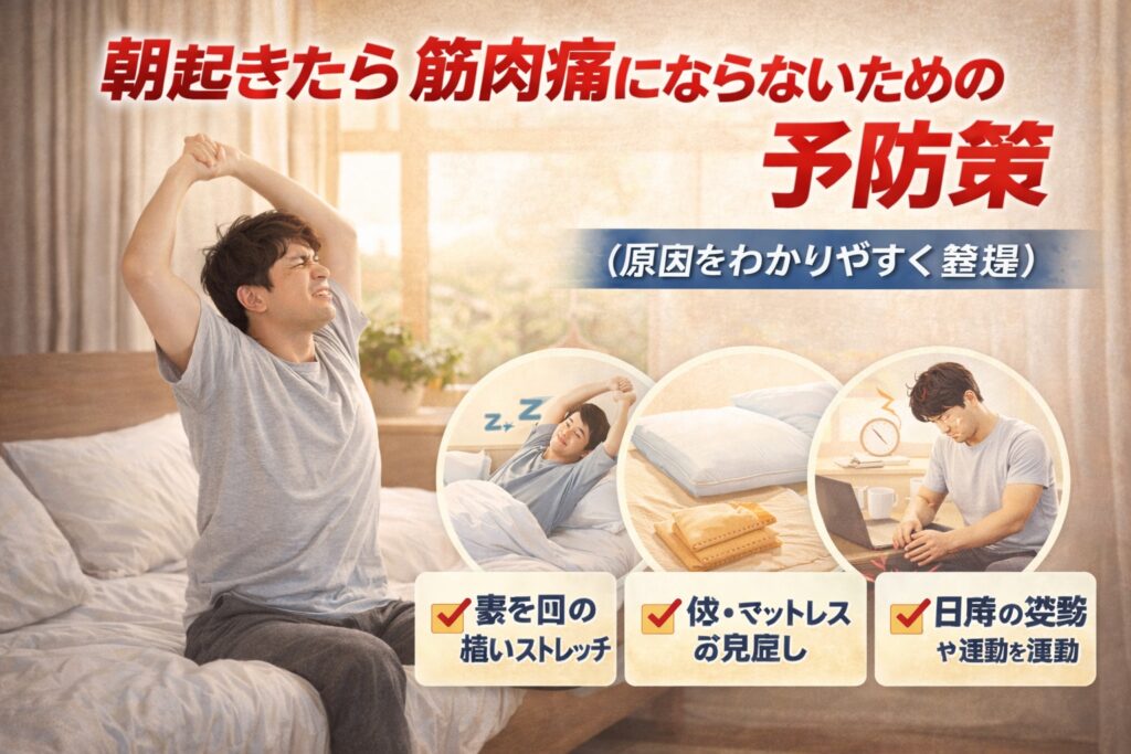 朝起きたら筋肉痛のように体が痛い原因は、寝ている間の血流低下・筋肉のこわばり・寝返り不足・寝具の問題など複数あります。本記事では、運動していないのに痛む理由から、今すぐできる対処法・予防策までわかりやすく解説します。