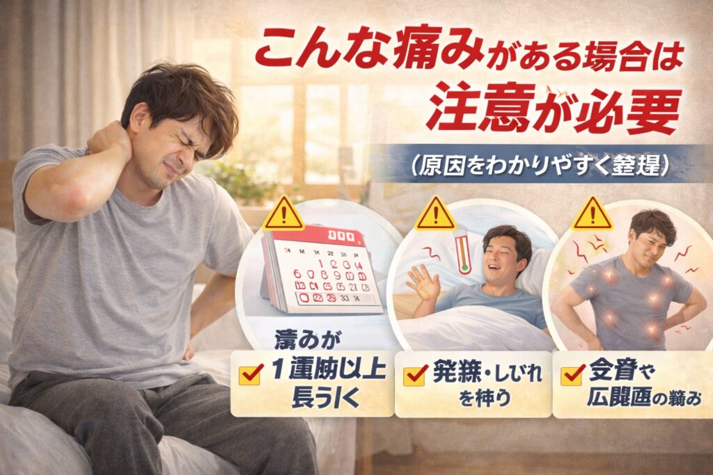 これらの症状は、単なる筋肉の問題ではないケースもあるため、自己判断を続けないほうがよいと言われています。
