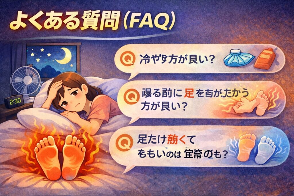 足が熱くて眠れないと、細かい疑問が次々出てきますよね。ここでは、知恵袋などでも特に多い質問を、体験談と専門情報を交えてまとめます。