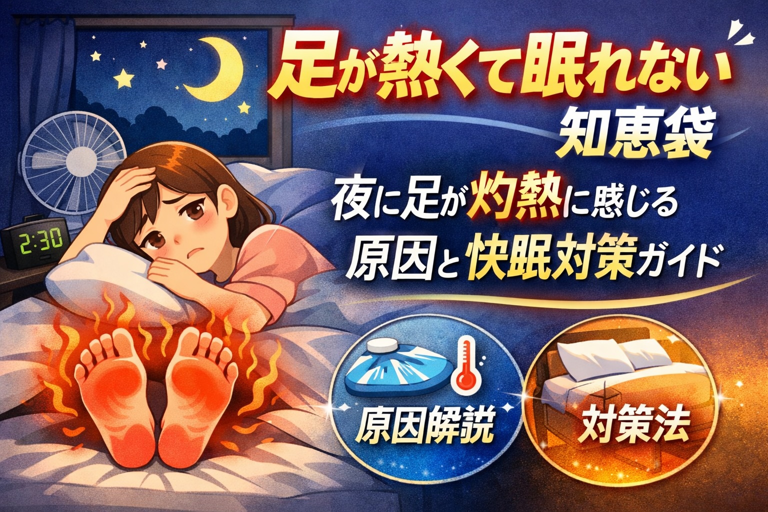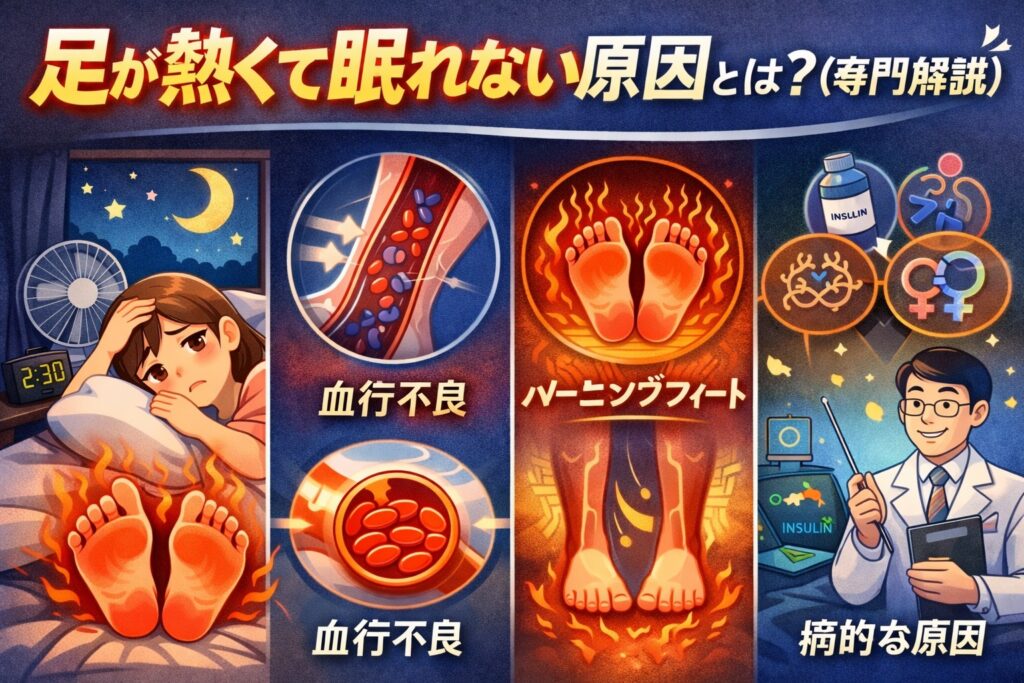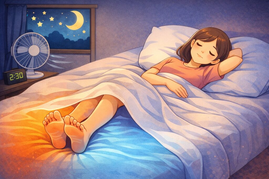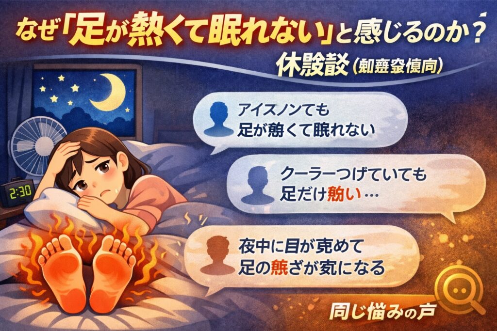 足が熱くて眠れない 知恵袋のような悩みに答える記事。足が夜に熱く感じる主な原因(血行不良・自律神経・神経障害など)と、今すぐできる快眠対策・対処法を専門家視点でわかりやすく解説します。