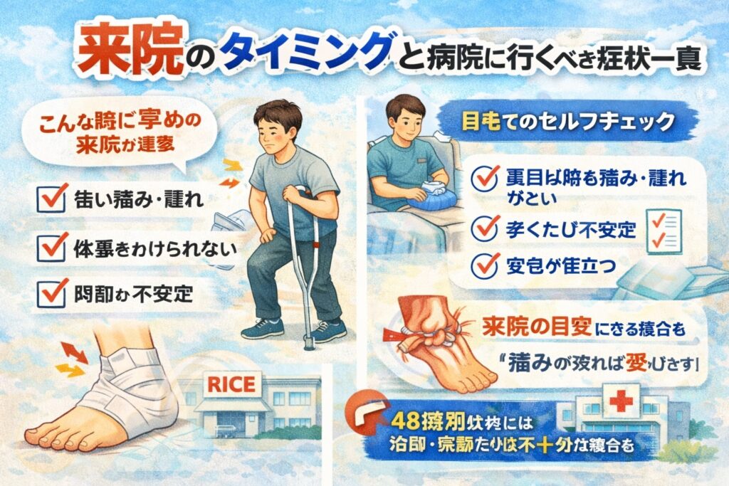 そんなときの目安として、足首の強い変形、体重をかけられない状態、皮膚の色が明らかに変わっている場合などは、早めの来院が必要になることがあると言われています。