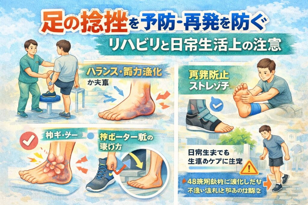 リハビリでは、足首を安定させる動きや体重移動の練習が行われることが多く、これが再発防止につながると言われています。