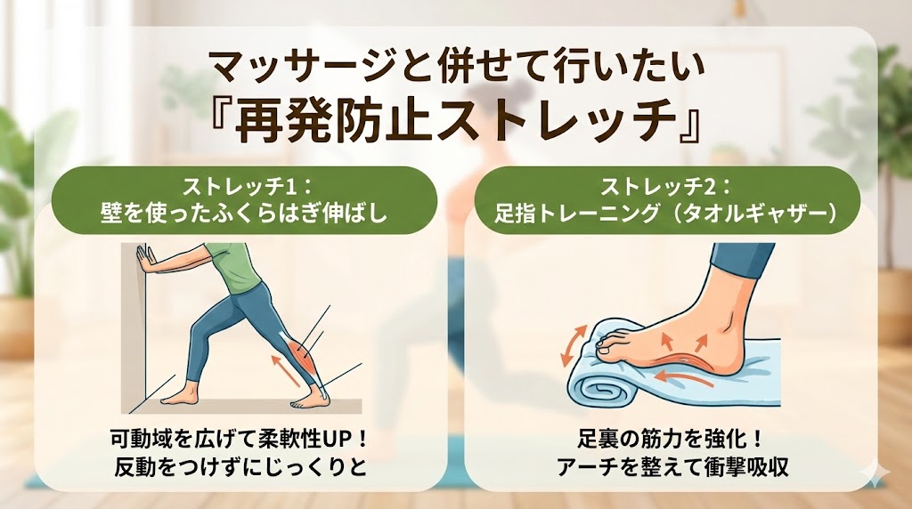 せっかくマッサージでふくらはぎや足裏が緩んでも、そのままにしておくと筋肉はまた元の硬さに戻ろうとしてしまいます。ほぐれた直後に適切なストレッチを行うことで、アキレス腱にかかるストレスを分散しやすくなると言われています。