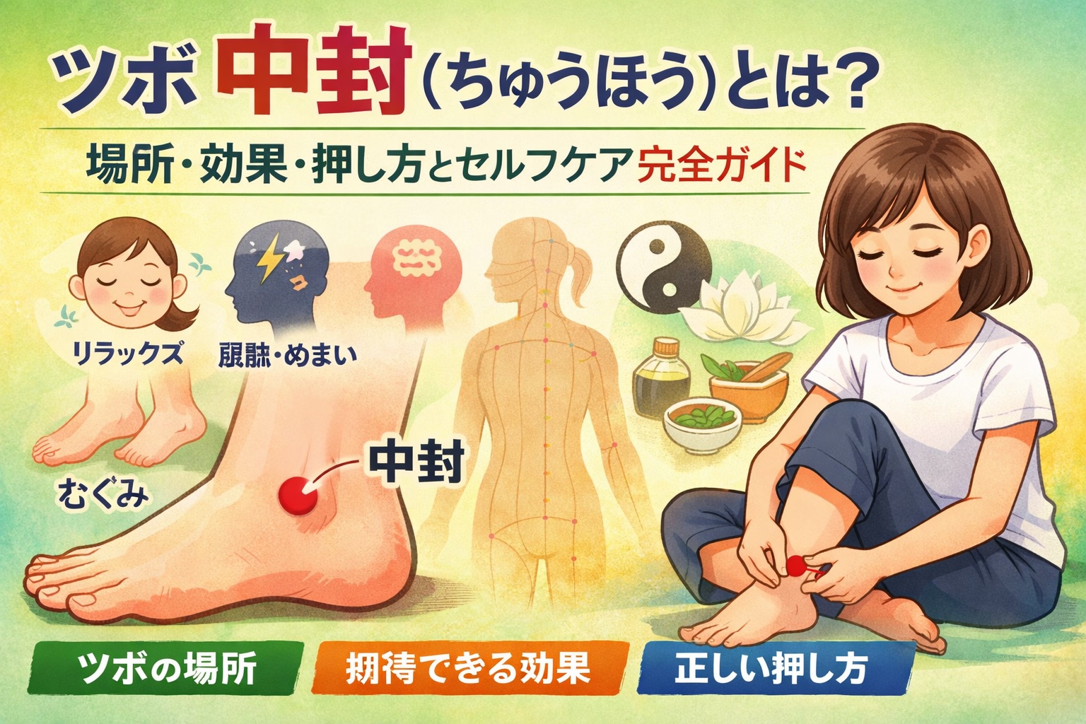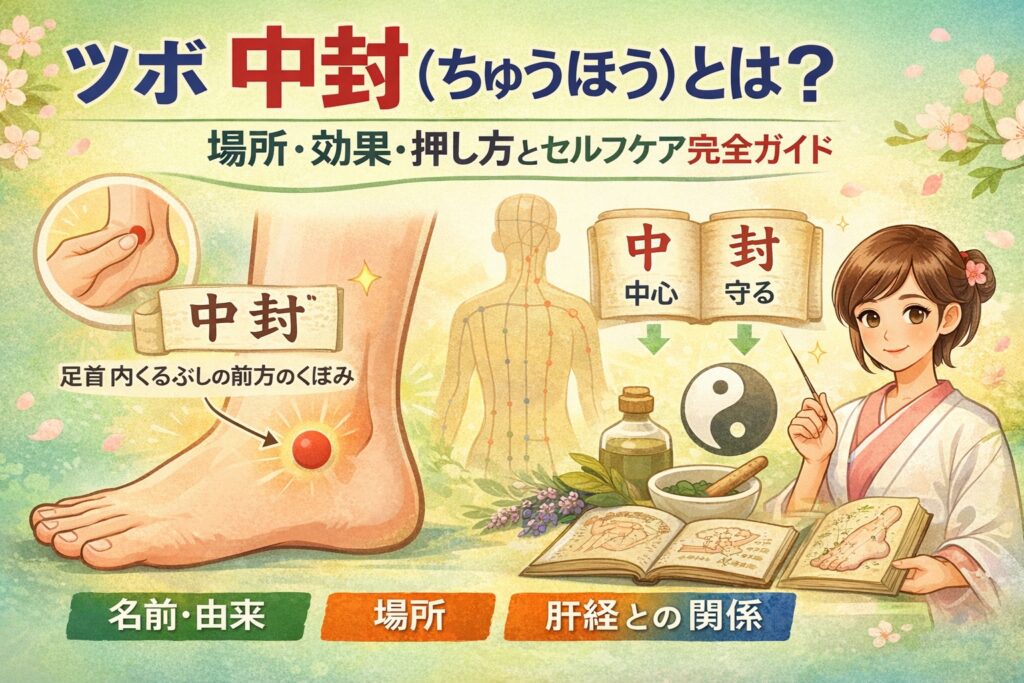 ツボ 中封(ちゅうほう)は足首前内側にある重要な経穴。位置の見つけ方から、ストレス・むくみ・目の疲れなど体の不調に効く効果、正しい押し方、注意点まで丁寧に解説します。