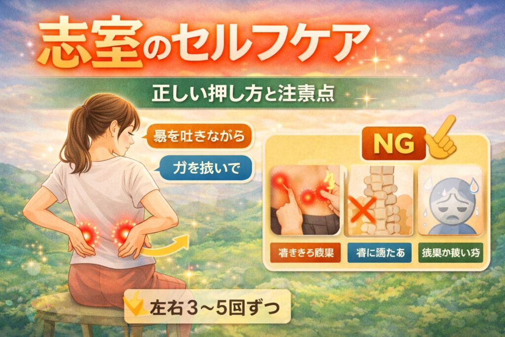 「志室って、どうやって押せばいいの?」とよく聞かれます。会話風にまとめると、「呼吸に合わせて、やさしく」が基本だと言われています。
