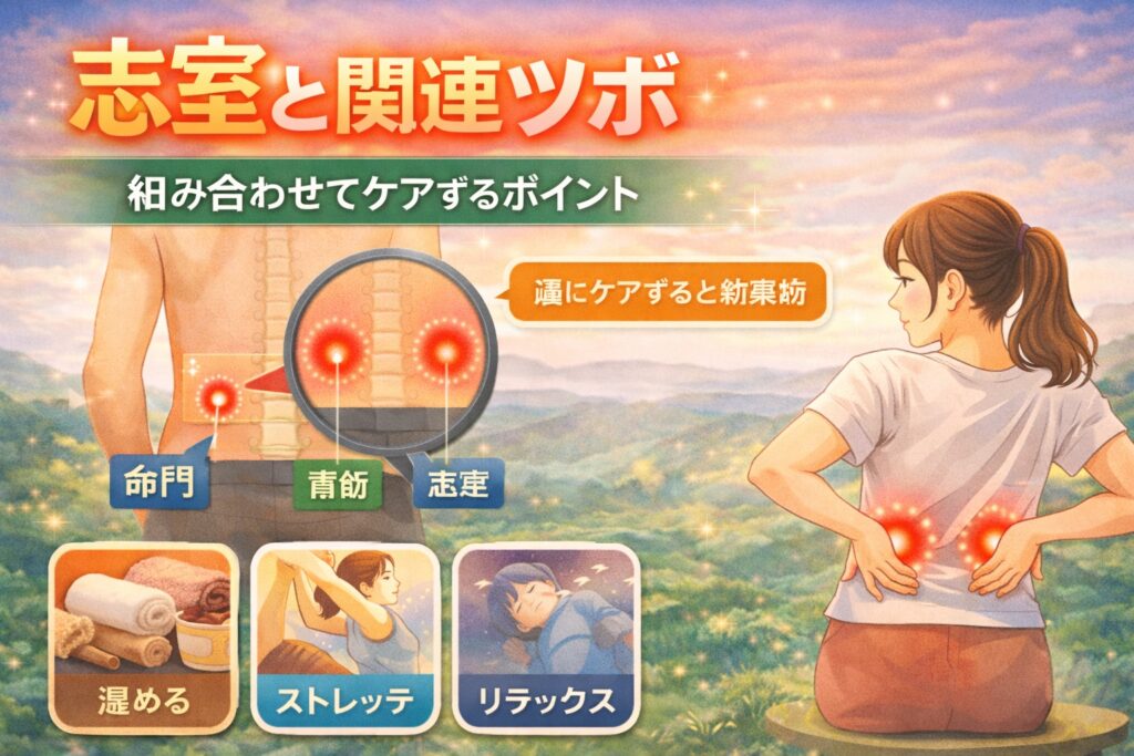 「志室だけ押せばいいの?」と聞かれることがありますが、実際には複数のツボを組み合わせてケアする考え方がよく紹介されています。代表的なのが**腎兪(じんゆ)・命門(めいもん)・大腸兪(だいちょうゆ)**です。