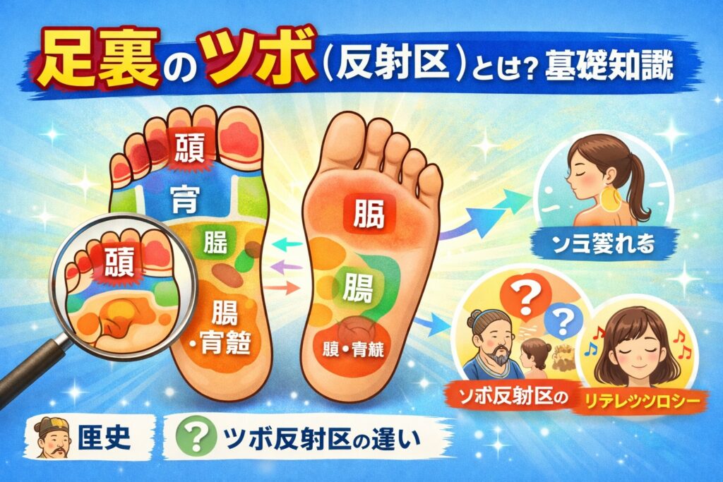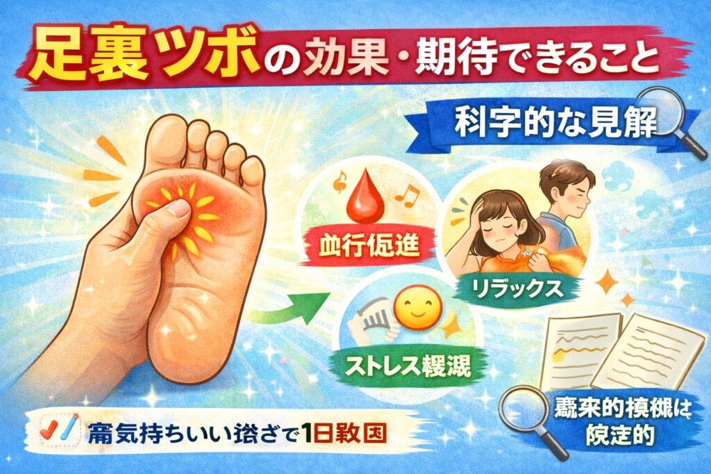 「足裏を押すとスッとするのは気のせい?」と聞かれることがあります。足裏ツボ(反射区)への刺激は、血行が促されやすくなる感覚や、リラックスしやすい状態につながると感じる人が多いと言われています。