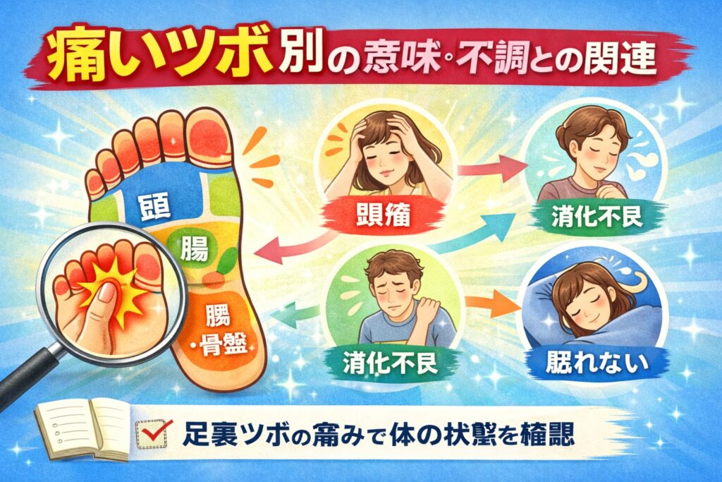 ただし、「痛い=その部位が悪い」と決めつける考え方ではありません。日常の疲労、体の使い方、冷えなどが重なって、反射区が敏感になっているケースもあるそうです。「最近、座りっぱなしが多かったな」「寝不足が続いているかも」といった生活背景を振り返るきっかけとして使われることが多い、と紹介されています。