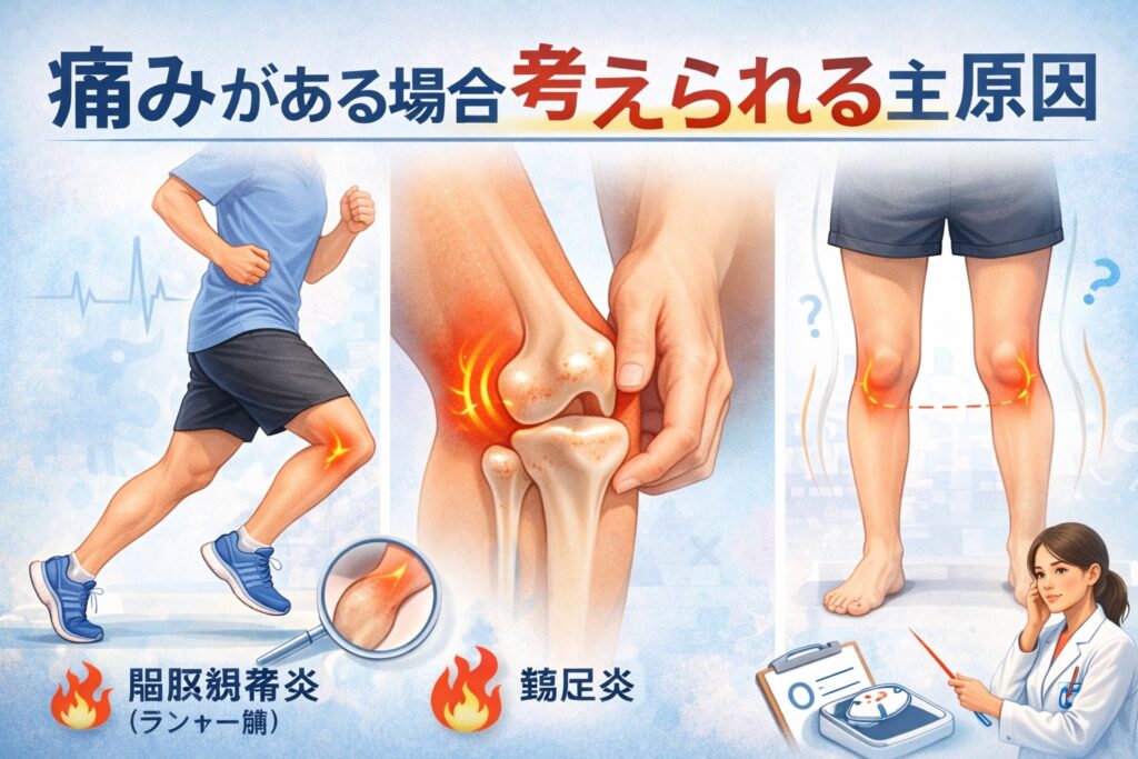 一方で、「内側がピンポイントで痛む」という場合は鵞足炎が関係している可能性も考えられます。太ももから膝内側につながる腱に負担がかかり、運動後に腫れや違和感が出るケースがあると言われています。