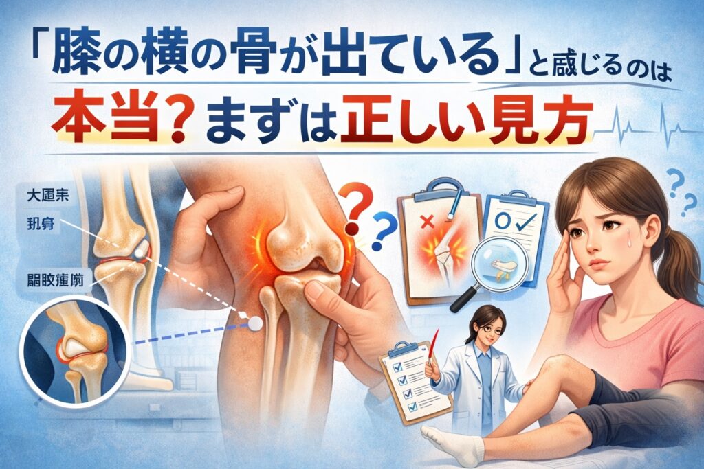 膝の横の骨が出ている場合、何が原因なのか不安ですよね。本記事では「なぜ骨が出るのか」「痛みがある場合の原因」「セルフチェック方法」「整形外科での診断ポイント」「日常でできるケアと予防法」までわかりやすく解説します。