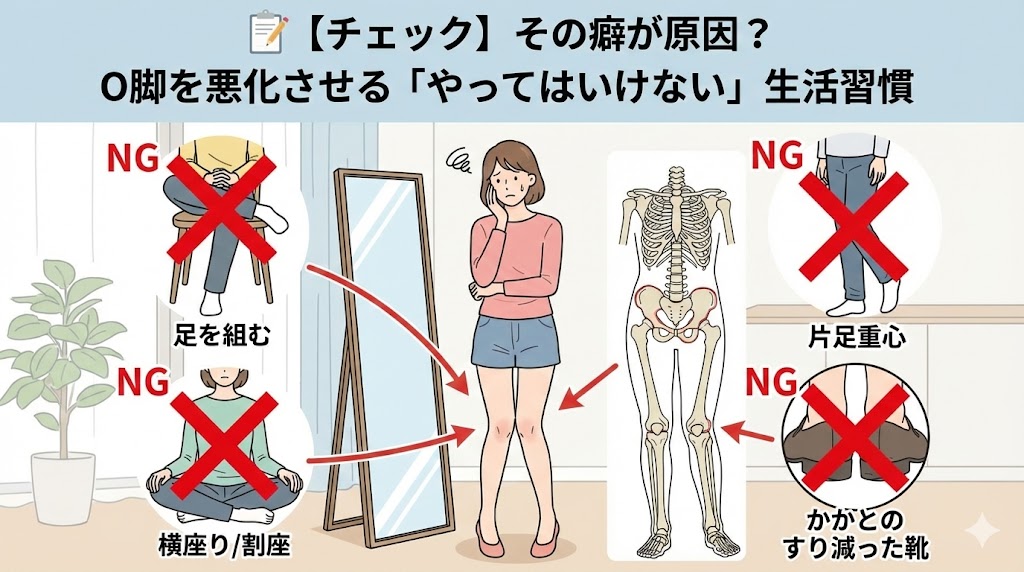 「最近、鏡を見るたびに膝の間が広がってきた気がする……」と感じていませんか?実は、日常の何気ない動作の中に、O脚を加速させる「やってはいけない習慣」が潜んでいることがあります。
