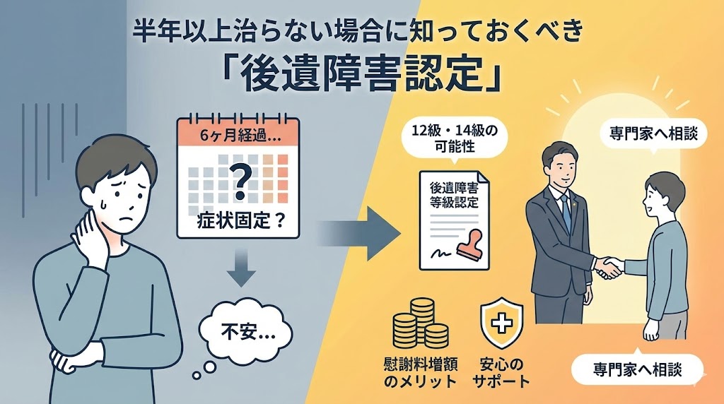 事故から半年が経過しても、「まだフワフワする」「急に景色が回る」といった症状が残っていると、本当に心細いですよね。懸命に検査や施術を続けても変化が乏しくなったとき、一つの区切りとして検討されるのが「後遺障害認定」という仕組みだと言われています。これを知っておくだけで、将来への不安が少し軽くなるかもしれません。