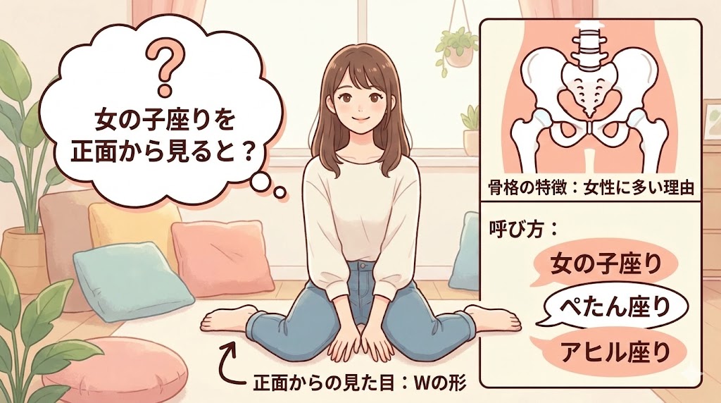 女の子座りとは、両膝を曲げて左右に開き、お尻を床につける座り方のことです。正面から見ると、足が「W」の形に見えるため、別名「W座り」や「アヒル座り」とも呼ばれます。 引用元:https://www.krm0730.net/blog/3089/