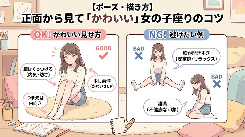 2.【ポーズ・描き方】正面から見て「かわいい」女の子座りのコツ