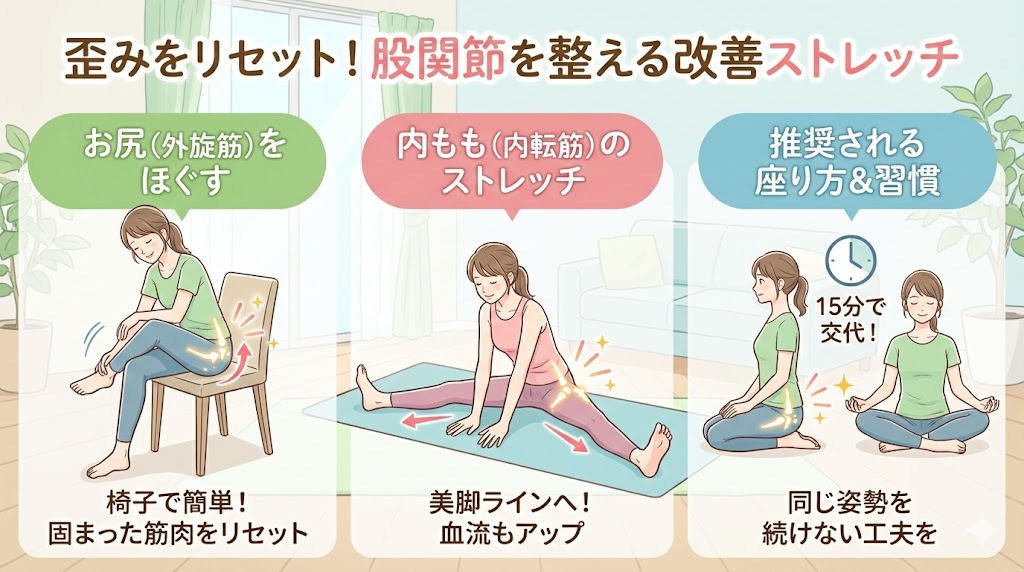 女の子座りで固まった股関節をリセットするには、お尻の筋肉や内ももを伸ばすストレッチが効果的です。逆の動きを取り入れることで、歪みの改善につながると言われています。 引用元:https://www.krm0730.net/blog/3089/