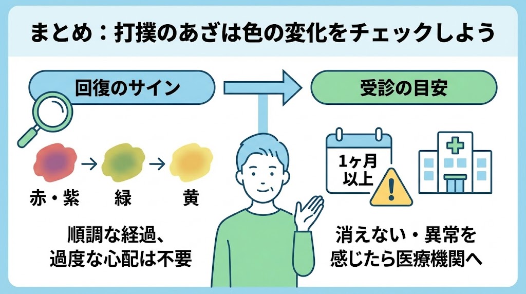 ここまで、打撲によるあざの色やその変化について詳しく見てきました。自分の体の状態を正しく知ることで、少しだけ気持ちが軽くなったのではないでしょうか?あざの色は、体の中で起きている「修復作業」の進み具合を教えてくれる大切なバロメーターと言えますね。
