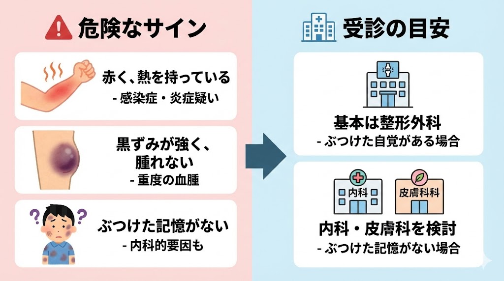 「たかが打撲」と思っていても、中には少し注意が必要なサインが隠れていることもあります。あざの色や状態が普段と違うな、と感じた時にチェックしてほしいポイントをまとめました。不安な気持ちを抱えたままにせず、早めに対応を考えていきましょうね。