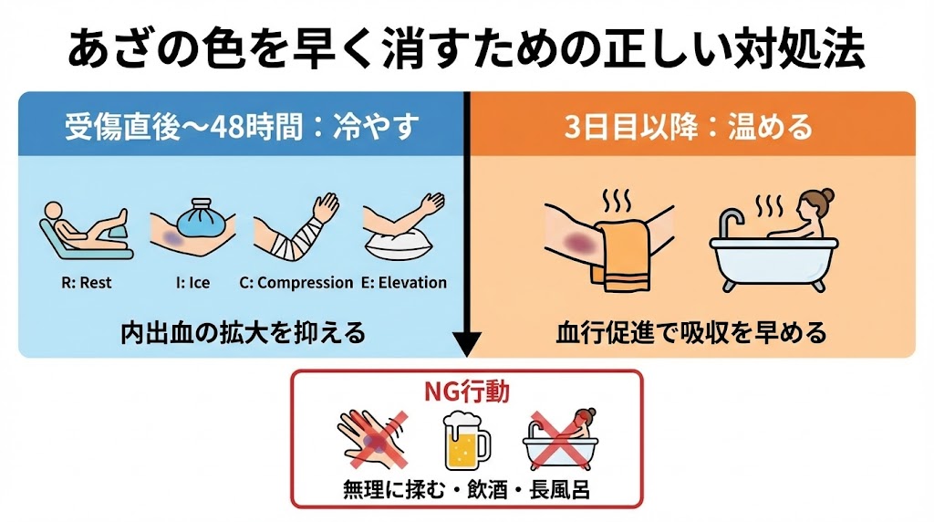 「大切な予定があるから、少しでも早くあざを隠したい!」という気持ち、本当によくわかります。実は、ぶつけた直後と数日後では、すべき対処が真逆になるのをご存知でしたか?このタイミングの見極めが、スムーズな改善への近道になると言われています。