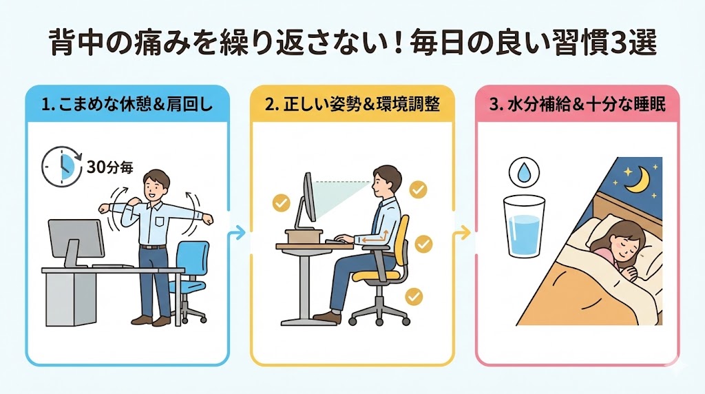 さらに、睡眠は体全体の組織を修復するための大切な時間です。 しっかり眠ることで筋肉の疲労が抜けやすくなり、翌朝の背中の軽さにつながるかもしれませんね。意識的に水を飲み、夜は早めに体を休めることを心がけてみてください。