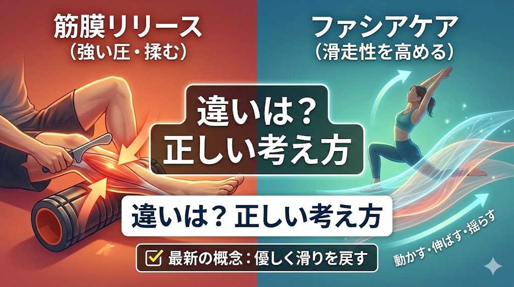 「筋膜リリースなら知っているけど、ファシアケアと何が違うの?」という声も聞こえてきそうですね。