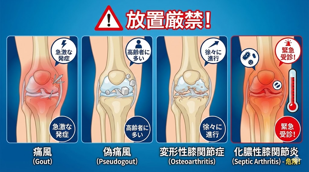 「ただの痛風だから放っておけばいいや」と考えるのは、少し危ないかもしれません。もし、痛みに加えて「ガタガタ震えるような寒気」や「高熱」がある場合は、細菌が関節に入り込む「化膿性膝関節炎」という緊急性の高い状態の恐れがあると言われています。