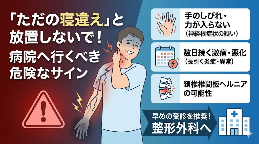 特に、手にしびれがある場合や、じっとしていても激痛が走る場合は、筋肉の炎症ではなく神経や頸椎(けいつい)の問題である可能性も考えられます。その際は、我慢せずに専門の医療機関へ来院して検査を受けるのが、改善への一番の近道ですよ。